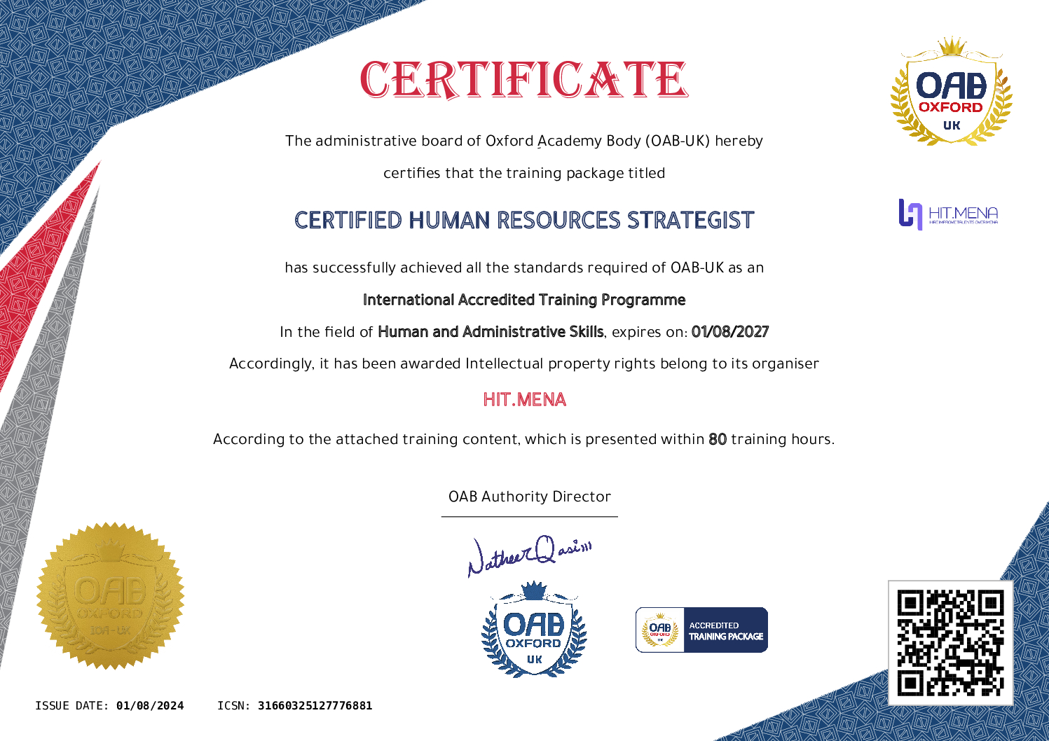 This certificate confirms that the training package (programme/course) has achieved all the standards OAB-UK requires for certified training programmes. The organiser (training centre/independent trainer) has intellectual property rights to this training package in the specific training field. The organiser has the right to use the logo of the internationally certified training package in ads and request that international certificates be issued to participants in the Certified training programme. This certificate validates your learning and opens doors to professional growth and advancement.