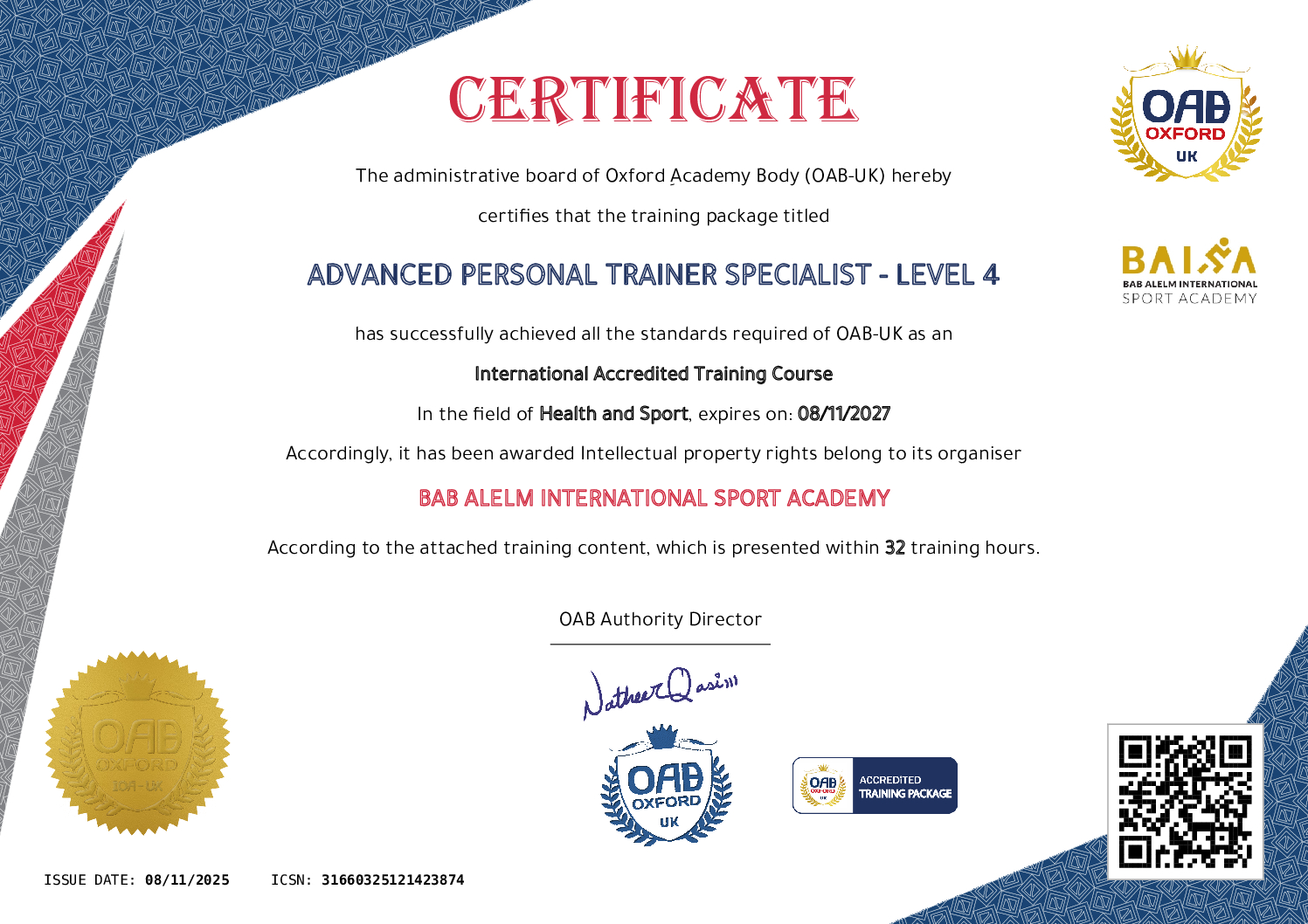 This certificate confirms that the training package (programme/course) has achieved all the standards OAB-UK requires for certified training programmes. The organiser (training centre/independent trainer) has intellectual property rights to this training package in the specific training field. The organiser has the right to use the logo of the internationally certified training package in ads and request that international certificates be issued to participants in the Certified training programme. This certificate validates your learning and opens doors to professional growth and advancement.
