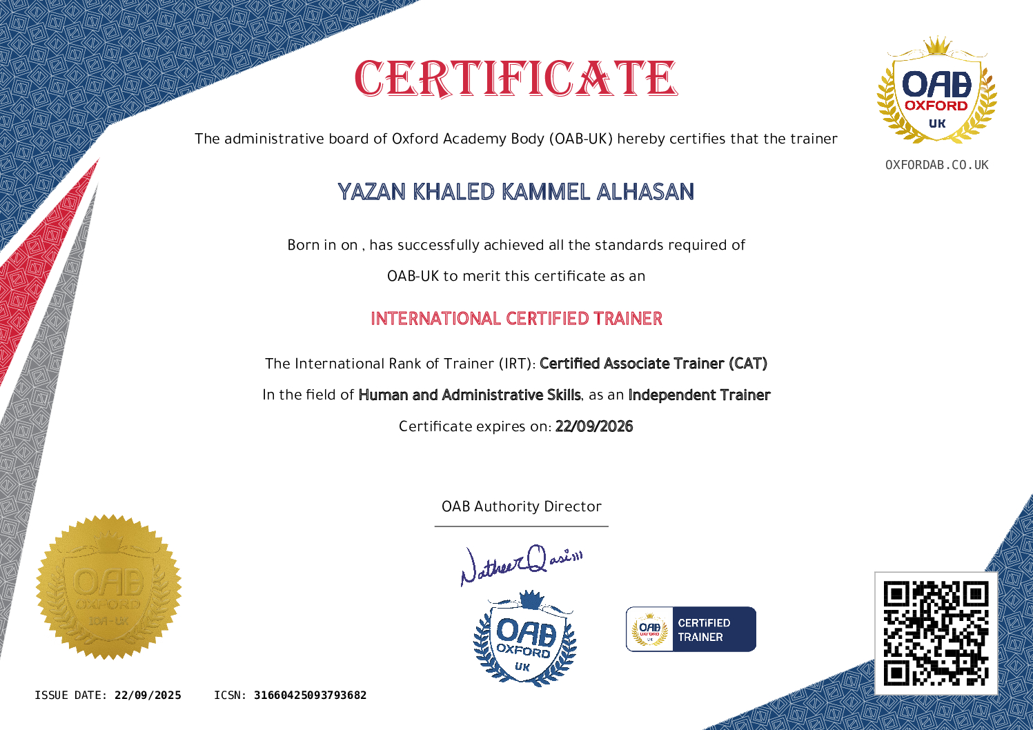 The International Certified Trainer certificate is a testament to the holder’s dedication and expertise. It signifies that the trainer has Met all the rigorous standards OAB-UK sets, earning the prestigious title of an internationally accredited trainer. This recognition reflects the trainer’s experience and proficiency in their specific training field. Accordingly, the trainer’s profile (Independent or Associated) on the OAB-UK website documents his international accreditation and rank. He has the right to use the logo of the certified international trainer in ads and request that certificates be issued to participants in his accredited training courses and programmes, with his name typed on these certificates.