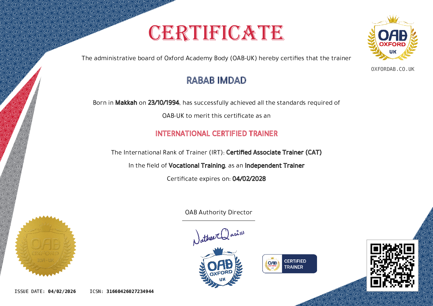 The International Certified Trainer certificate is a testament to the holder’s dedication and expertise. It signifies that the trainer has Met all the rigorous standards OAB-UK sets, earning the prestigious title of an internationally accredited trainer. This recognition reflects the trainer’s experience and proficiency in their specific training field. Accordingly, the trainer’s profile (Independent or Associated) on the OAB-UK website documents his international accreditation and rank. He has the right to use the logo of the certified international trainer in ads and request that certificates be issued to participants in his accredited training courses and programmes, with his name typed on these certificates.