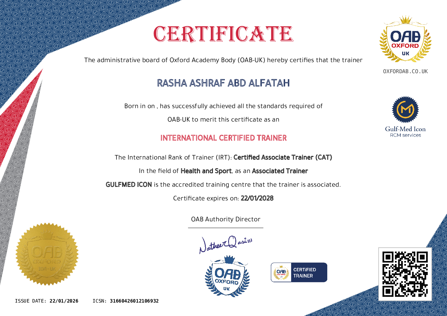 The International Certified Trainer certificate is a testament to the holder’s dedication and expertise. It signifies that the trainer has Met all the rigorous standards OAB-UK sets, earning the prestigious title of an internationally accredited trainer. This recognition reflects the trainer’s experience and proficiency in their specific training field. Accordingly, the trainer’s profile (Independent or Associated) on the OAB-UK website documents his international accreditation and rank. He has the right to use the logo of the certified international trainer in ads and request that certificates be issued to participants in his accredited training courses and programmes, with his name typed on these certificates.