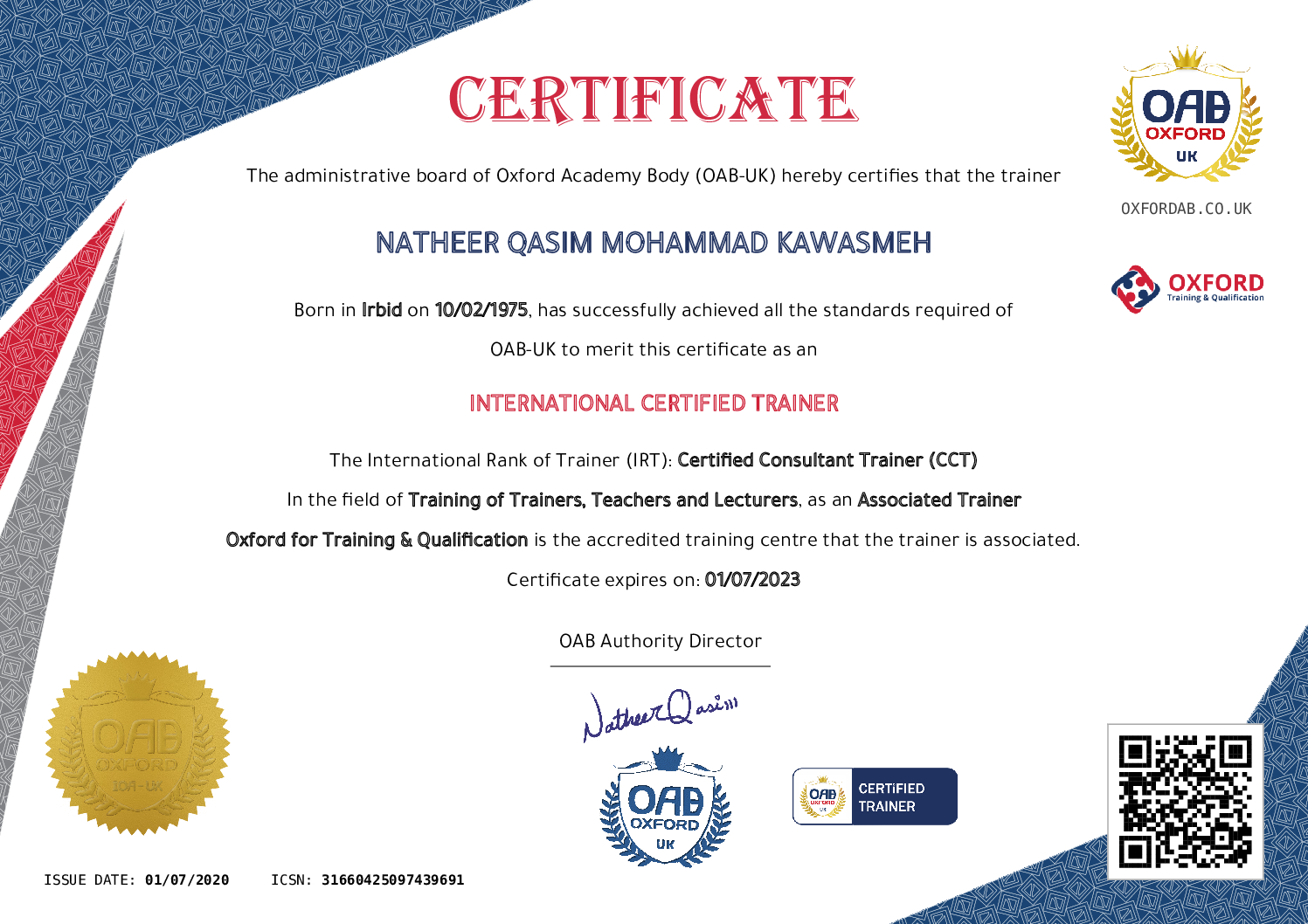 The International Certified Trainer certificate is a testament to the holder’s dedication and expertise. It signifies that the trainer has Met all the rigorous standards OAB-UK sets, earning the prestigious title of an internationally accredited trainer. This recognition reflects the trainer’s experience and proficiency in their specific training field. Accordingly, the trainer’s profile (Independent or Associated) on the OAB-UK website documents his international accreditation and rank. He has the right to use the logo of the certified international trainer in ads and request that certificates be issued to participants in his accredited training courses and programmes, with his name typed on these certificates.